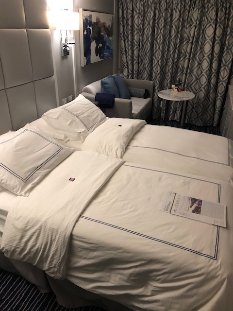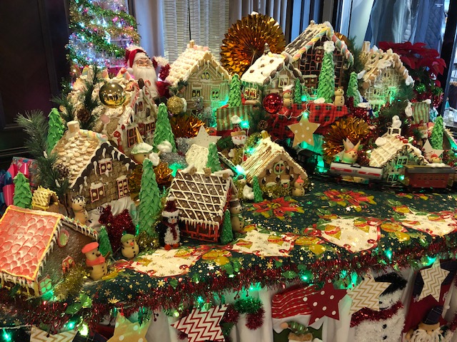 As I mentioned, there were pluses and minuses to Oceania. Our first minus was the bed configuration. It seems no matter what our profile states, we get a single bed, instead of two beds. I love my daughter, but do not wish to share a bed with her. And as you can see by the picture, even two beds are one bed with no space between! On most ships there is a nightstand placed between the beds to give each occupant a little personal sleeping space. On Viking there is complimentary beer, wine and soda with lunch and dinner. On Oceania, only the soda is complimentary. Karen had to pay for wine, and the glass of wine was rather expensive and a low pour. The food, especially the pastries were much better on Oceania. Viking needs to kidnap their pastry chef! Another difference is the airfare and transfers. With Viking if you purchase air, the transfers from airport to pier are included. Not so much with Oceania unless you have a pre or post hotel stay. For this trip, they wanted $89 per person, one way! Our Uber cost a fraction of that price! So, that extra cost needs to be factored in. The excursions on Oceania are rather costly and uninteresting. Why wouldn’t they have an excursion to Muir Woods while in San Francisco? We booked privately with GrayLine. With Viking, each port of call has a complimentary included excursion. Yours to take or not. The bathroom on Viking is twice the size of Oceania’s overall and in the shower and it has a heated floor! Depending on the type of cabin booked, Viking has a complimentary beer and soda mini bar with snacks. Something unique with Oceania is that even at the buffet, you are served. And the table area does not look like a cafeteria, like on Viking. Even at dinner time, the tables on Oceania had a tablecloth. We noticed an extremely ‘relaxed’ service in the Main Dining Room. It would take over 2 hours for dinner, with long waits in between courses.While there are times when Viking’s Dining Room service seems a bit rushed, at least I’ve never had to send my meat back for a re-fire! Tea time was also different on Oceania. A trolley was pushed around and you were served from various plates of sweet and savory bites. Best to get what you want the first time as they make the rounds of all the tables. On Viking, you are provided with a 3-tiered tray of bites. I wish the string quartet had played Christmas songs during tea. Going back to the pastry chefs on Oceania, their gingerbread display beats the pictures I’ve seen of Viking’s gingerbread display, hands down.