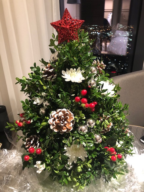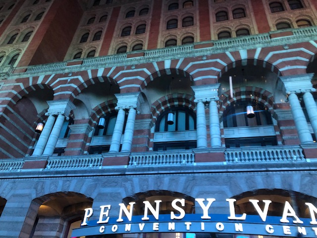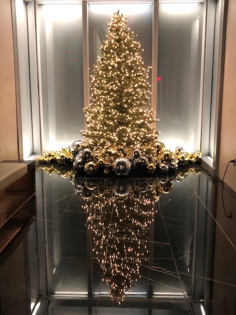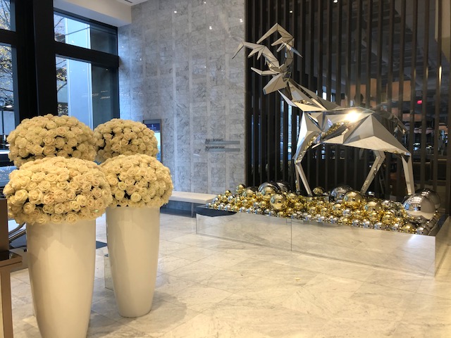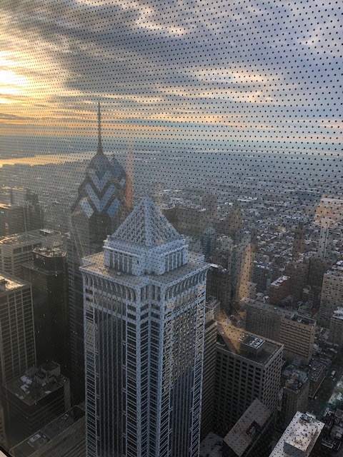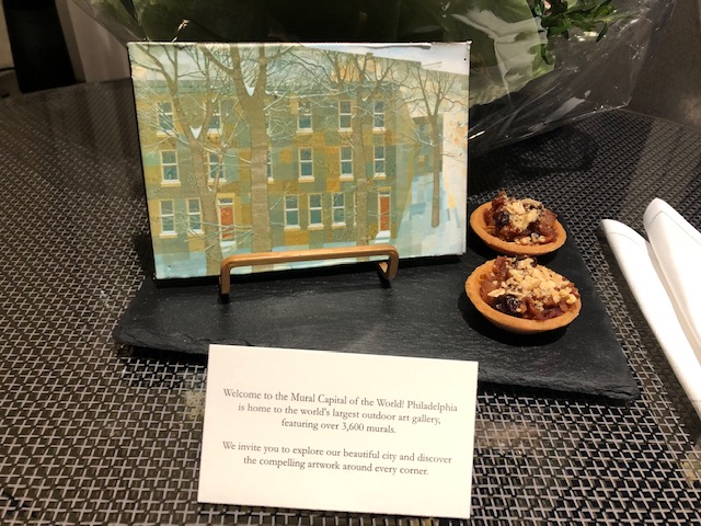 Our complimentary stay at the new Four Seasons Philadelphia was very nice. The staff was friendly and wonderful and we were well taken care of. The hotel decorations were very well done. Each of the white urns in the reindeer picture hold 150 white roses! We enjoyed the amenity which consisted of two tarts and a chocolate bar with a picture on it. It’s amazing what can be done with chocolate! Karen had the beautiful boxwood tree added to the room. Since we drove, we brought it home to enjoy and it sits on our kitchen island adding more festive-ness to the house! A special shout out to Emily and Fernando. We enjoyed a couple light bites and dessert in the lounge – one was a Philly spring roll. The desserts were a poached pear with caramel sauce and carrot cake. I’ve never had cream cheese frosting that silky smooth before! Wish it had some fruit and nuts in the cake though. The view from the lounge and pool areas is amazing! We were told that when it snows, it’s like being inside a snow globe! It was interesting to go to the lobby on the 60th floor! Our room was on the 52nd floor – what a view! We waved to the window washers outside – wouldn’t want their job – and they waved back! We had a slow drive home due to traffic and were very tired from our busy, but short and wonderful 2-1/2 days in Philly. Time to re-pack the suitcases for our upcoming holiday cruise!