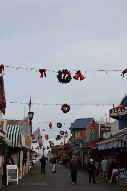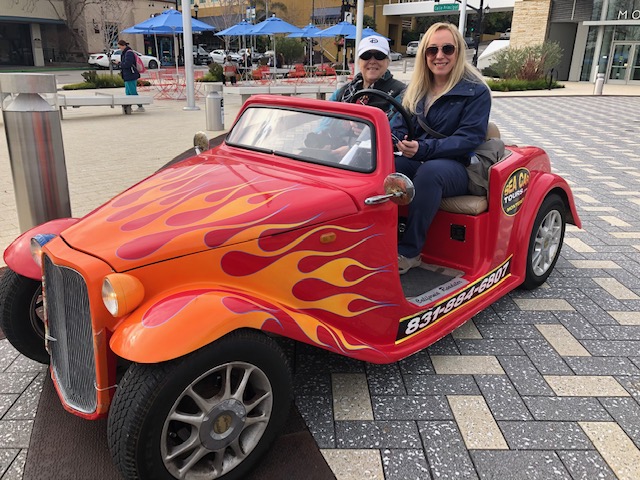Our third port of call was Monterey. Feeling better, we rented a red hot roadster (blinged out golf cart) and took a spin around to see the sights. We enjoyed the Old Fisherman’s Wharf as it was totally decorated for Christmas. After our roadster trip, we searched out a restaurant where Karen could get a chowder bread bowl and I could find something (yes, I’m a picky eater!).