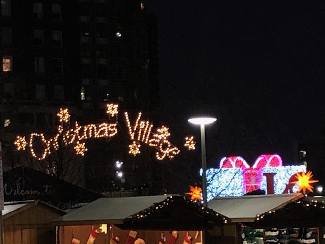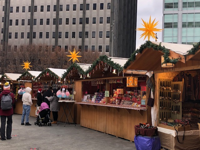 Christmas Village in Philadelphia is modeled after traditional German Christmas Markets. The most famous is the Christkindlmarkt in Nuremberg, Germany. The goods presented in wooden booths include a rich variety of holiday gifts including Christmas ornaments, arts and crafts, toys, sweets, as well as German food and drinks. People stroll around, meet friends, and enjoy live performances of Christmas music.
