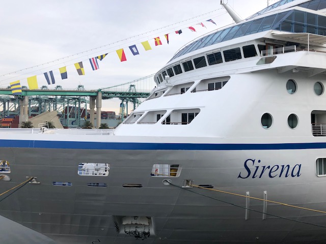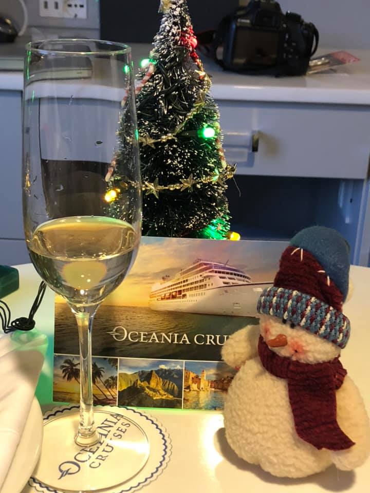 We decided to try something new, instead of using Viking, our old standard, we tried Oceania, a similar small ship. There definitely are pluses and minuses but in the end, we decided that we’d stick with Viking unless Oceania offers us a deal too good to pass up! I liked the ‘warmth’ of Oceania’s decor vs the Ikea Scandinavian decor of Viking. The ship we were on, Sirena, was recently refurbished after being bought from Princess Cruise Line. With only 630 passengers max, there was plenty of opportunity to meet fellow passengers and rarely a line at any food operations. Our cabin was typical in size and style. We opted for a bow-facing cabin, which we will most likely never do again as it hit the waves rather violently, but the view was nice. But that same view you can get on your cabin TV. Mid-ship is the way to go for a smoother ride. We brought along a little decoration for the cabin and enjoyed having it lit when we were in the cabin. It brought a smile to our face and to our cabin steward and room service personnel. We started the cruise with a complimentary champagne toast. And then we were off!