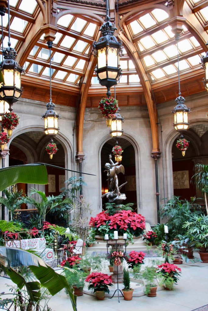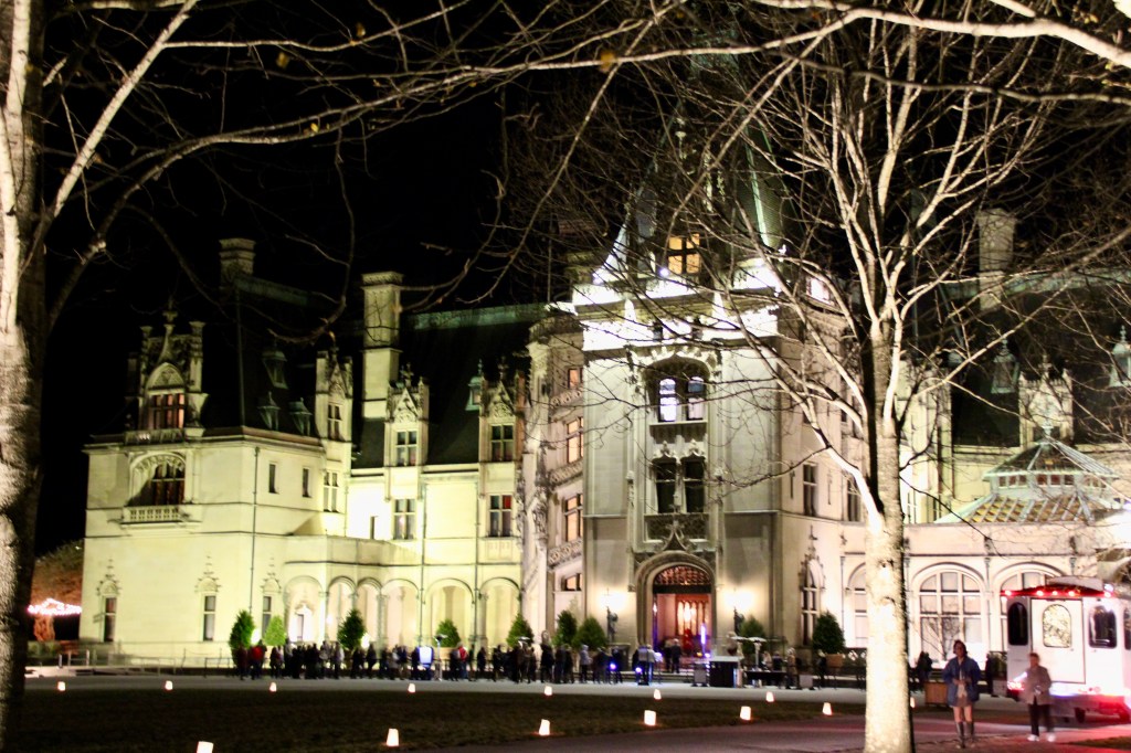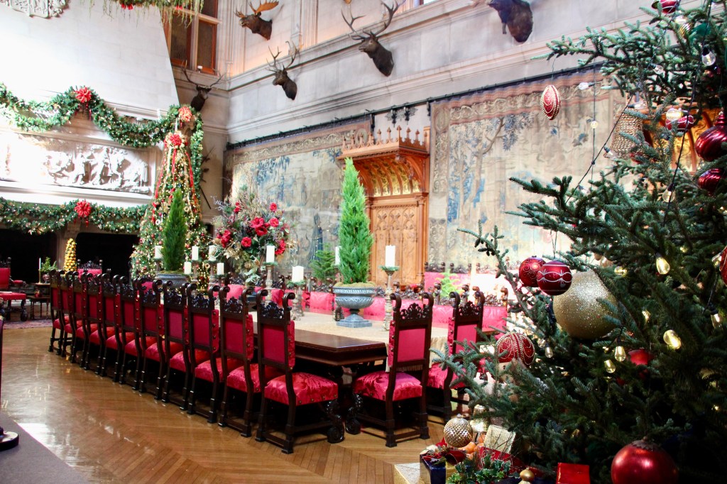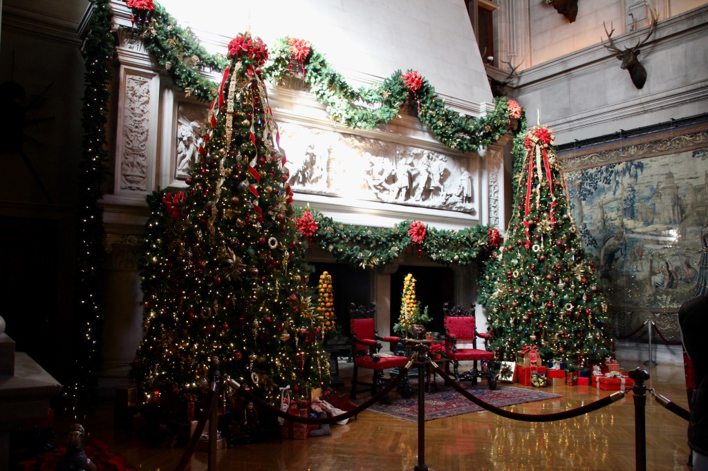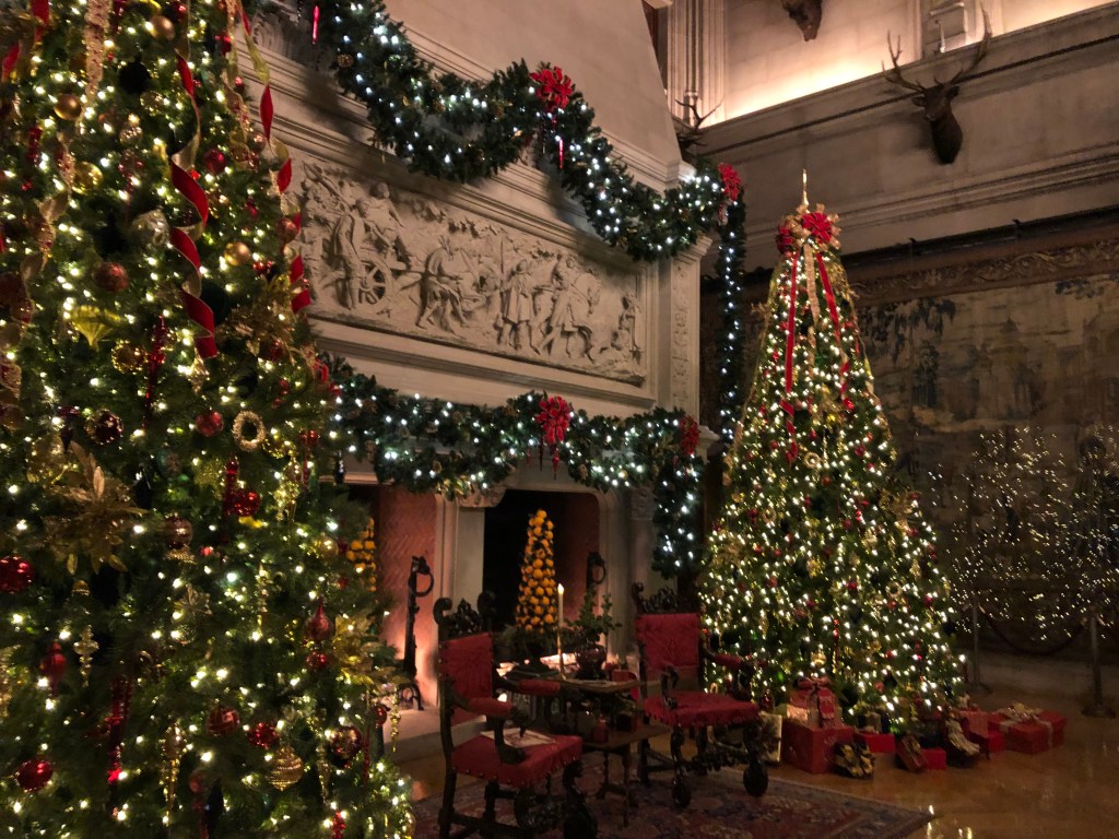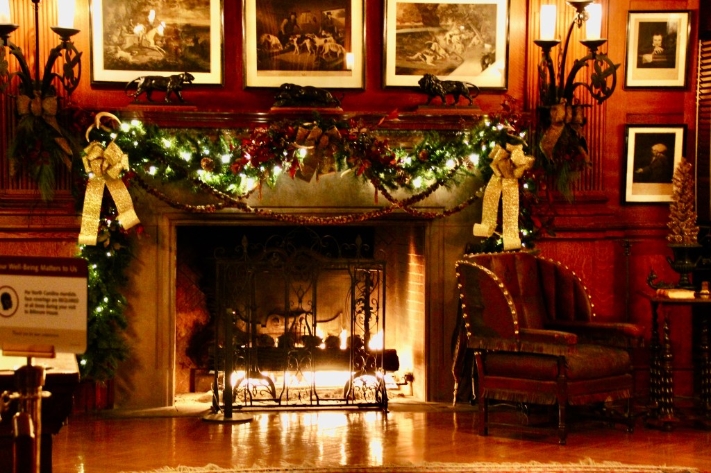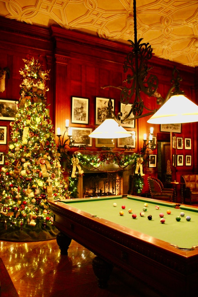 Throughout the estate, there were 100+ decorated trees with 25,000+ ornaments, 1.5 miles of fresh garlands, 500 wreaths and sprays, 2,000 poinsettias and other favorite holiday plants and 100 kissing balls! Definitely lots to look at in addition to the wonderful room displays we visited. As we walked through the estate our first night for the Candlelight tour, the fireplaces were ablaze with roaring, warming fires. So warm, in fact, that there were windows open! Various areas had instrumentalists playing holiday songs for our enjoyment. There is a room for everything in the estate, from a tapestry room to a gun room, from a breakfast room to a music room. Bedrooms with identifying names greeted guests on the upper floors. Bachelors had their own wing. There were living halls, lounges, sitting rooms and a winter garden. The guests of George Vanderbilt wanted for nothing during their stay.