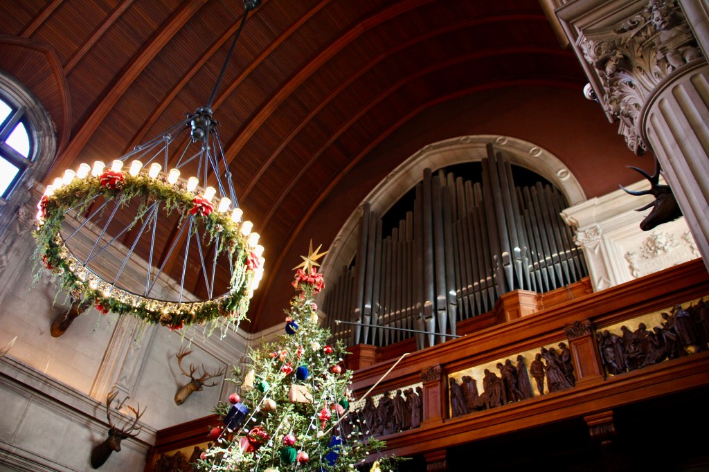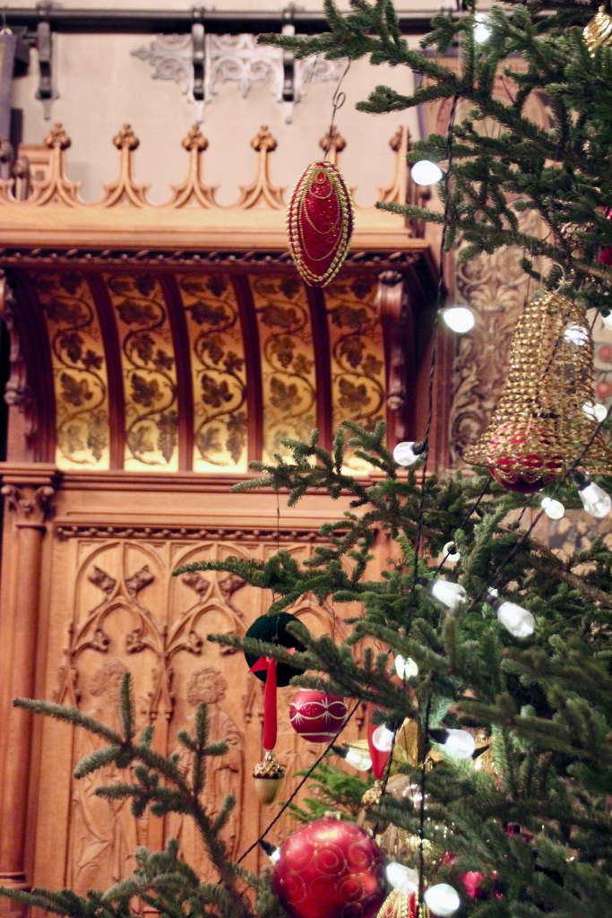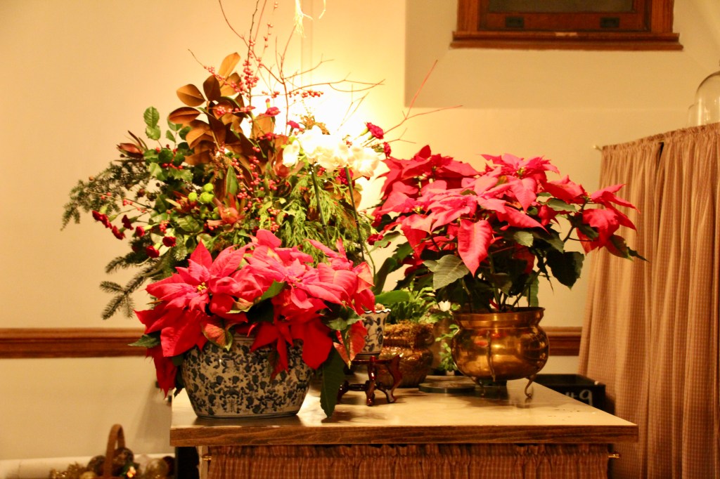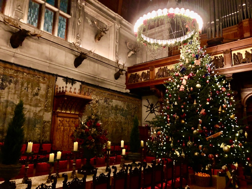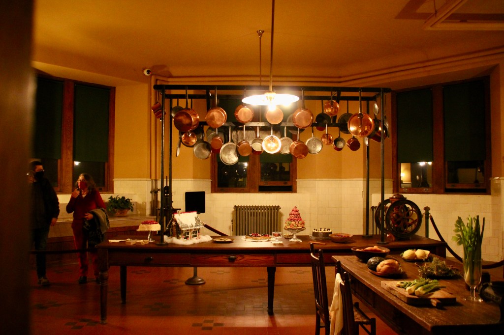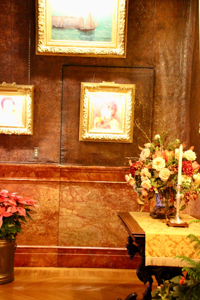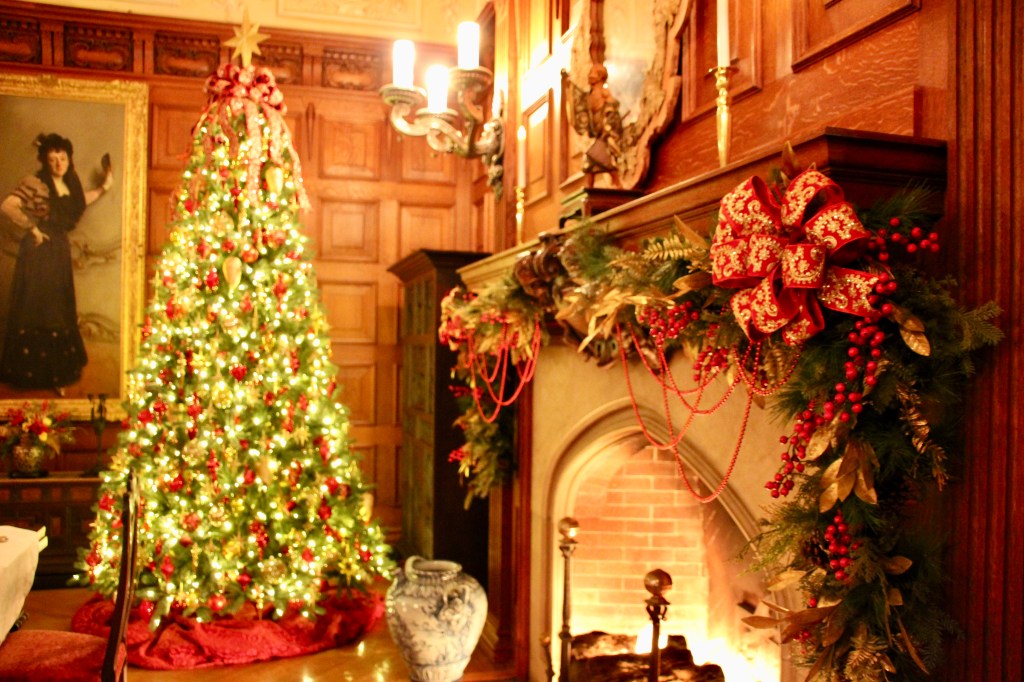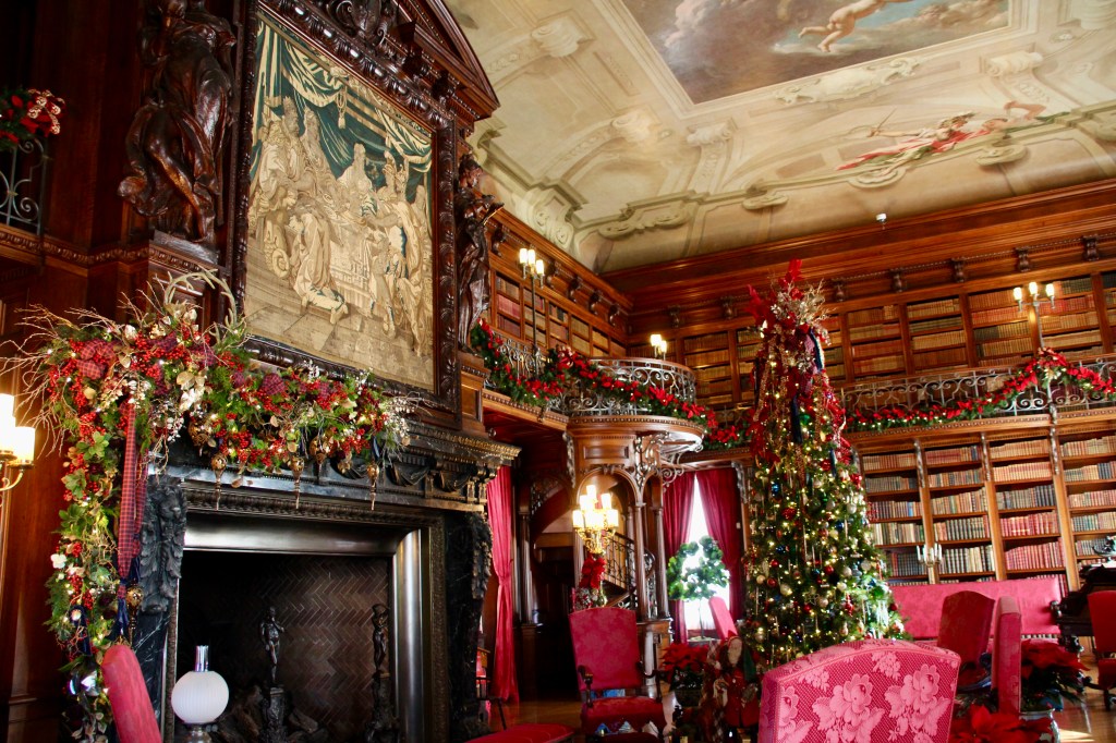 Throughout the estate, there were 100+ decorated trees with 25,000+ ornaments, 1.5 miles of fresh garlands, 500 wreaths and sprays, 2,000 poinsettias and other favorite holiday plants and 100 kissing balls! Definitely lots to look at in addition to the wonderful room displays we visited. As we walked through the estate our first night for the Candlelight tour, the fireplaces were ablaze with roaring, warming fires. So warm, in fact, that there were windows open! Various areas had instrumentalists playing holiday songs for our enjoyment. There is a room for everything in the estate, from a tapestry room to a gun room, from a breakfast room to a music room. Bedrooms with identifying names greeted guests on the upper floors. Bachelors had their own wing. There were living halls, lounges, sitting rooms and a winter garden. The guests of George Vanderbilt wanted for nothing during their stay.