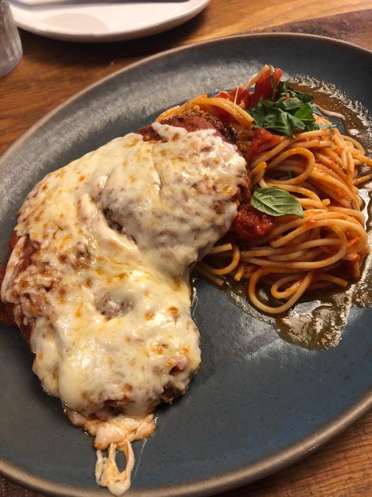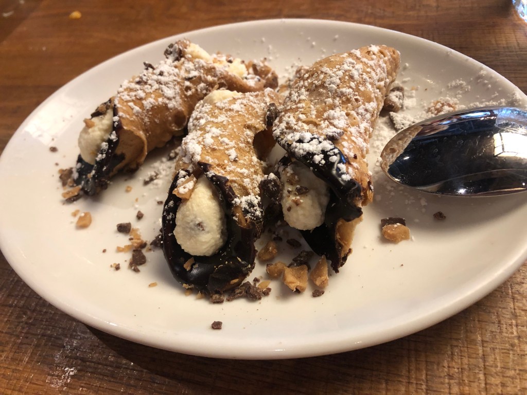 One last hurrah before heading north again, we decided to have a celebratory dinner at Disney Springs, Terralina Crafted Italian restaurant during the Magical Dining event. Karen and I love Chicken Parmigiana and order it often. (She’s actually become quite good at making it at home too!) Terralina was offering Chicken Parm as part of their Magical Dining menu ($37 for a 3-course meal). I started with the meatball appetizer. I received two good-sized meatballs, sauce and cheese on top of polenta. That was a meal in itself! Karen chose the Caesars salad – she’s a much more conscientious eater than I am sometimes! We both chose the Chicken Parm, which came hot out of the kitchen in a huge portion with spaghetti. Our dessert choice was the cannnoli – three of them on a plate with wonderful health like bits sprinkled around them. I actually enjoyed the bits more than I did the cannoli!
