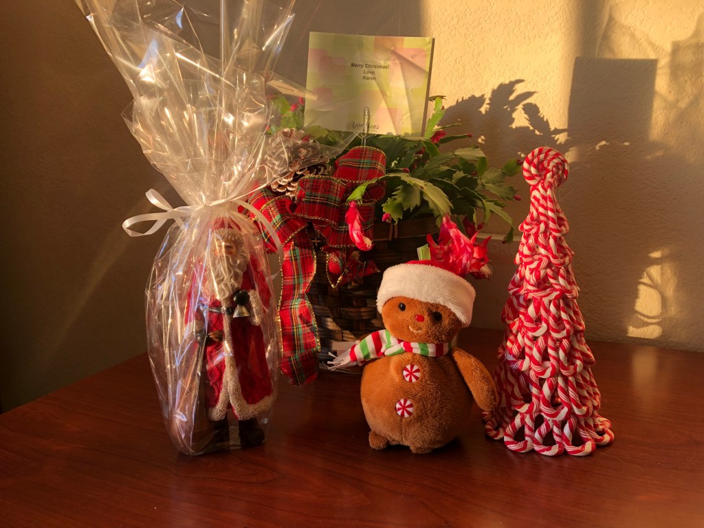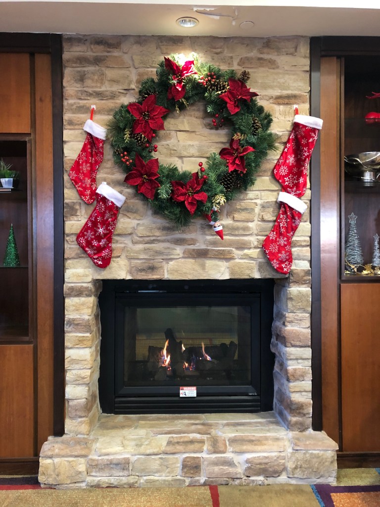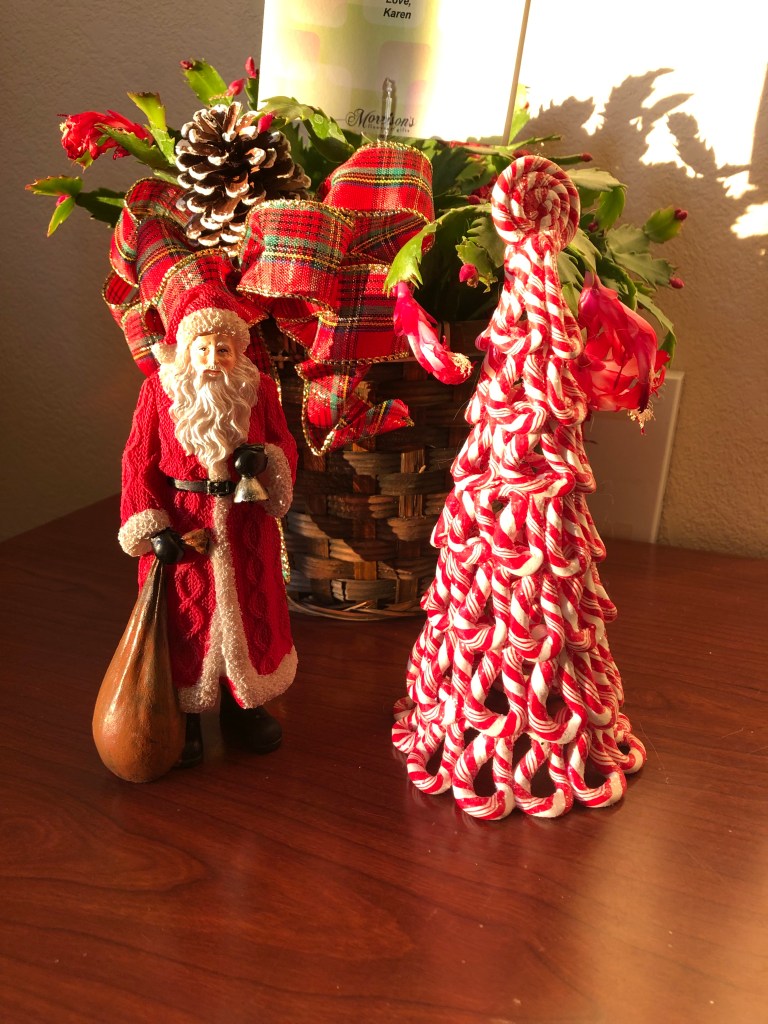 Our trip starts at the hotel where this beautiful fireplace welcomed us. Then, in our room, Karen surprised me with a lovely red Christmas cactus, which I hope to keep alive! The Santa figurine was a bonus that neither of us expected, placed in the middle of the plant! I had brought the candy cane tree and gingerbread snowman with me to brighten the room for Christmas.