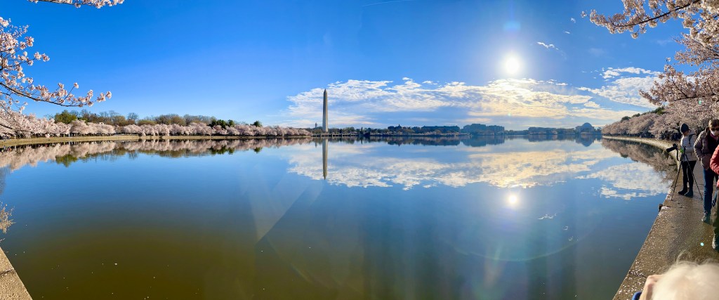 So, we set our alarms for o’dark thirty and headed to the Tidal Basin in search of cherry blossoms. It was unbelievable all the people that were already there! I guess they were there to catch the sunrise that illuminated the area memorials and the trees that were loaded with peak blossoms! Lots of photo opportunities for families, pets, dating couples, wedding couples and just simply the view across the Tidal Basin and blossoms up close and personal. We were very lucky to get a parking spot nearby (displaying a handicap hanger or license plate will net free parking) and headed towards the MLK Memorial for a path down to the Tidal Basin sidewalk. We were not disappointed as the sun came out, the Basin water was calm and still, making for good reflections of the trees and Washington Monument and Jefferson Memorial. It was very congested at this level as hundreds of people flocked to take their memorable pictures. Many thousands of dollars were being carried about in cameras, filters, tripods and more. The sun was warming up, the shade still cool. Areas of mud and puddles dotted the sidewalk making for an intersting maze of people and equipment to navigate.