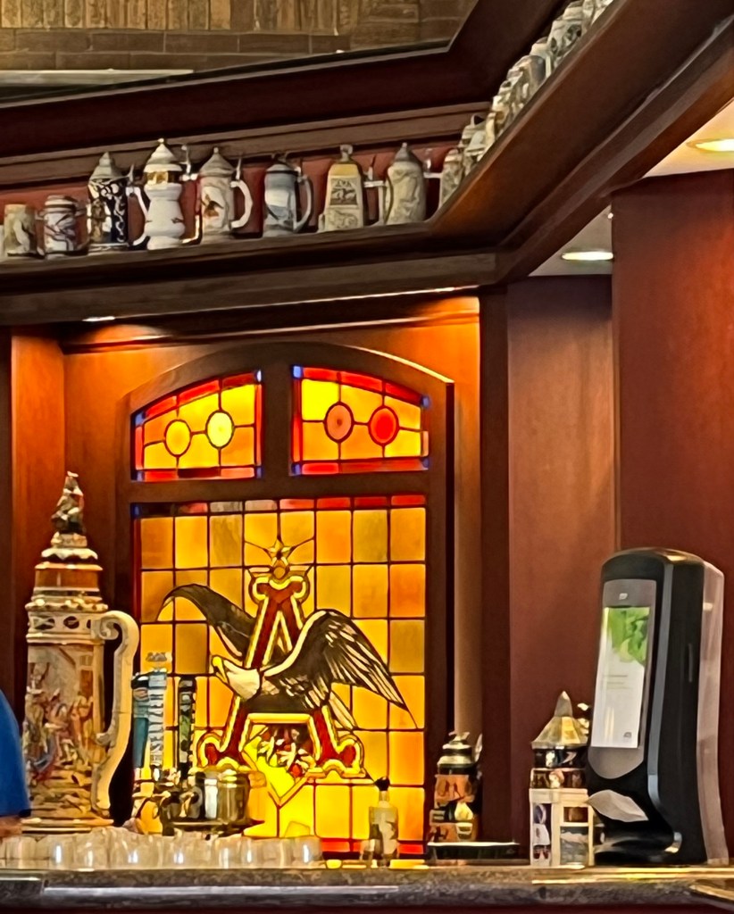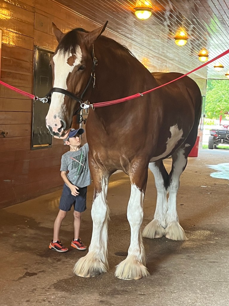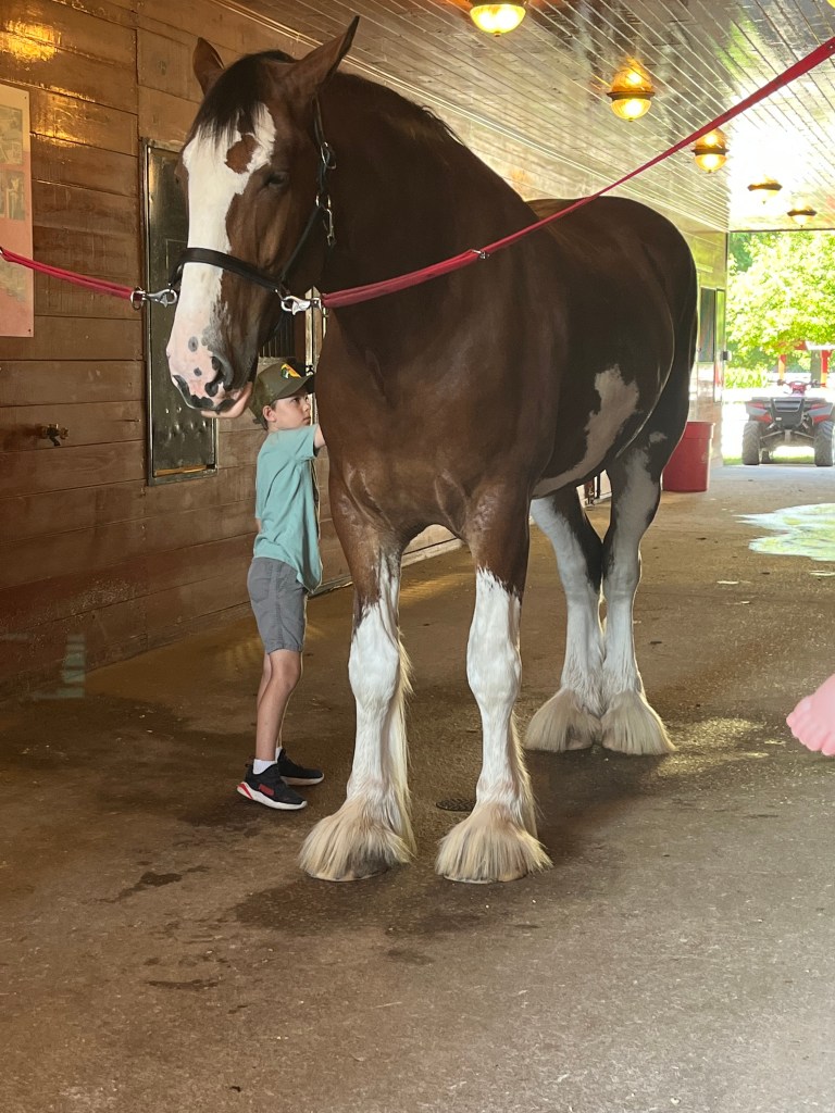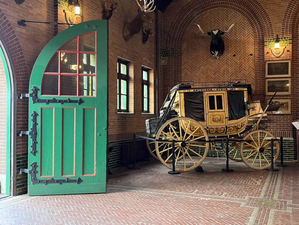 This is a very interesting farm and home to a few Budweiser Clydesdales, young, old and retired. We participated in a behind-the-scenes tour and started the day with a Bud beer and water. When you see these large 2000+ pound beauties pulling the wagon, know that they all started out the same way. Being born at Warm Springs Ranch in Boonville, transporting to Grant’s Farm at about age 6 months and start their journey with learning barn manners. What are barn manners you ask? Well each horse has a report card with 20 things to accomplish before being sent back to Warm Spring Ranch to start learning how to pull the hitch. But before any of this, all Budweiser Clydesdales must have approximately the same markings – white blaze down the nose, 4 white ‘feathered’ legs and be male. There are 3 coat colors that will determine if the horse is on an East coast hitch team (darker coat), a West coast hitch team (lighter coat) or the St. Louis hitch team (more of a red coat). Lots to learn about these magnificent gentle giants. The gear (reins, collar etc.) that they wear weighs about 150 pounds. It takes the handlers – who always wear red shirts – about 5 hours to groom and dress the team of 8 horses before each appearance. There are two dalmation dogs that are also part of the team and live and travel with the horses. There are always 10 horses sent with the hitch, but only 8 that pull the hitch. This is in case one or two of the horses don’t feel like working that day. These horses are pampered and never forced to work. The line up at the hitch is tall and big near the wagon, with shorter, show-offs high-stepping and setting the pace at the front. The story of how Anheiser-Busch came to be is definitely an interesting one!