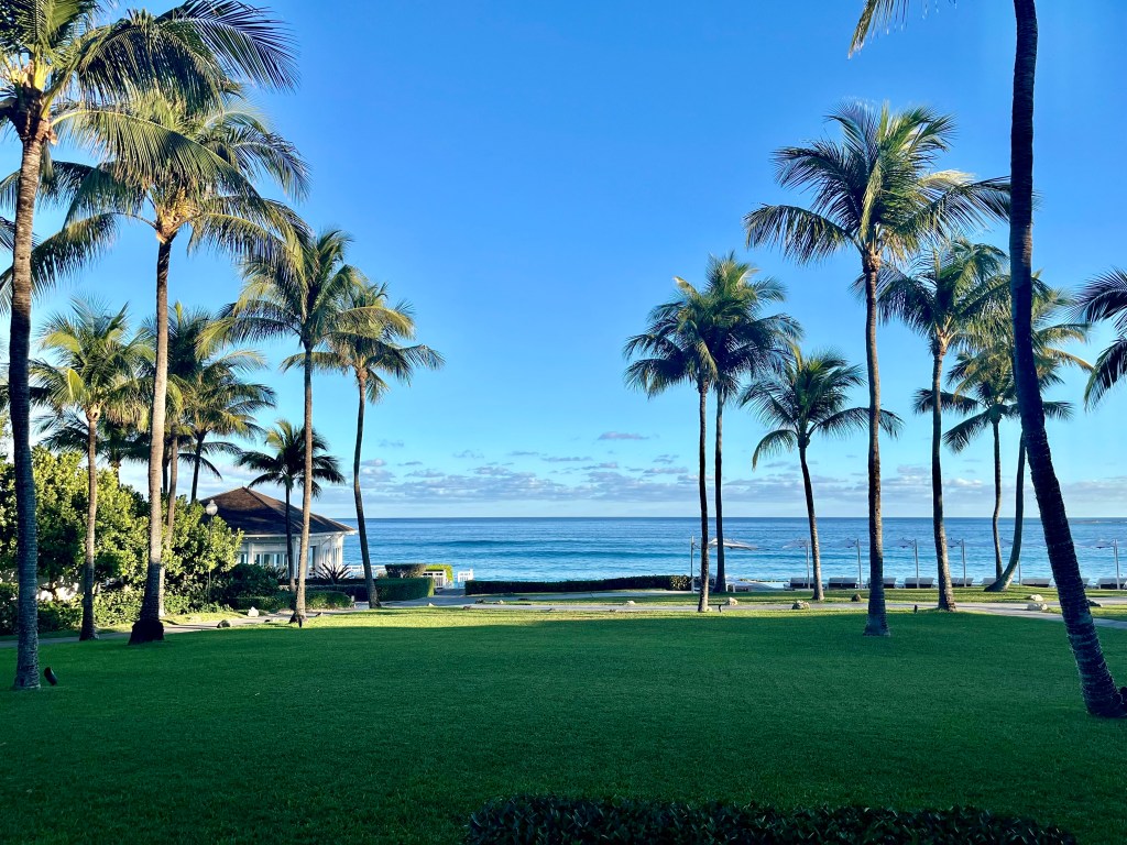Karen took a few amazing aerial views from the plane as we passed over on take off and on our Nassau approach. After a short flight from DCA to Nassau and an hour sitting on the tarmac waiting for a gate, our transportation from Cheryl’s Taxi and Tour greeted us after finding our way outside to the waiting spot. We were so very lucky they waited for us as the terminal posted we had arrived at a gate, when we did not. Our driver was none other than the owner of Cheryl’s Taxi and tours herself, Cheryl. A truly amazing woman who is a cancer survivor and small business survivor through the pandemic. Cheryl holds her staff to some high standards indeed. She regaled us with stories and points of interest as we drove to Ocean Club. Everyone knows Cheryl and is eager to assist her guests.