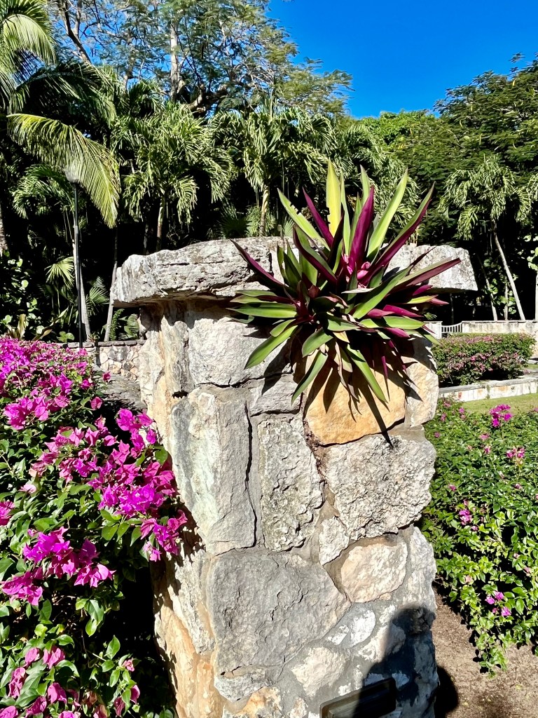 As we walked through the front doors, we were greeted with a complimentary rum drink that was delicious. I was a slow sipper however due to the medicines I’m taking. Our first floor guest room was off a wonderful open air courtyard with a bubbling fountain and conversation seating. Our lanai faced a wooded area. We enjoyed a meal out there and the usual quiet.