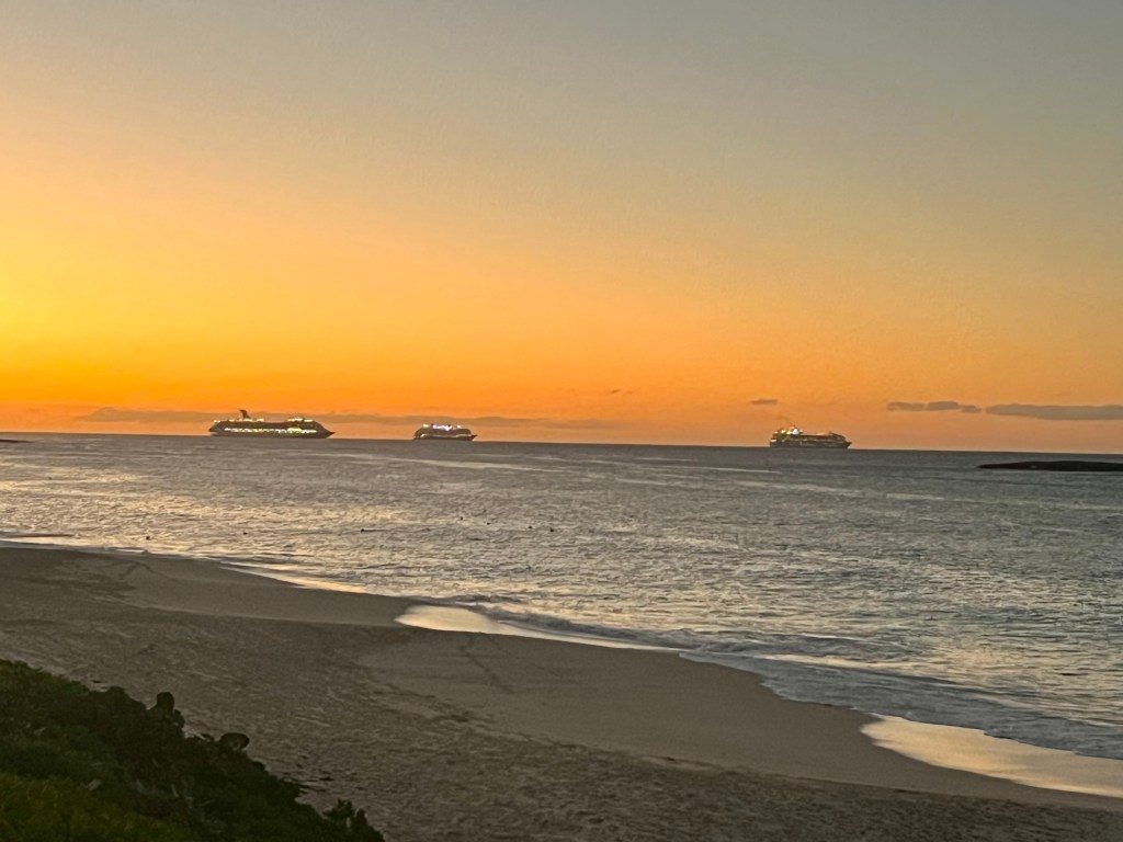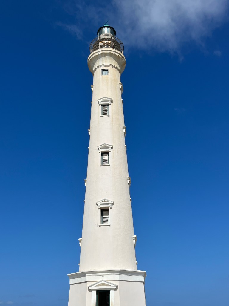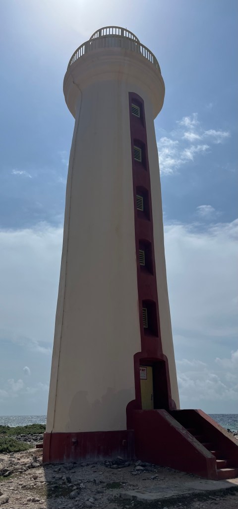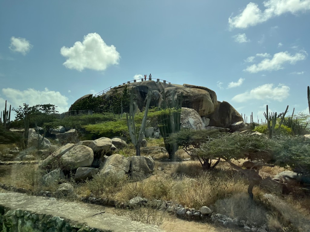 Aruba is a bustling harbor city. Someone on our ship got married in Aruba! Wow! Talk about a destination wedding! I still felt somewhat sick and decided to not participate in our shore excursion. Karen went and took pictures to show me what I missed. Interesting fun fact – there are no traffic lights in Aruba, only round-abouts. Karen scrambled up volcanic rocks to see a view of 80% of the island where there were plenty of cacti. She also walked up 190 steps to the top of California Lighthouse for another great view of the area. Afterwards, the tour stopped at an aloe farm with over 35,000 plants.The Divi-divi tree is a natural compass, always pointing west. To end the excursion, a stop was made at Eagle Beach, where Karen enjoyed a beer, ocean-side.