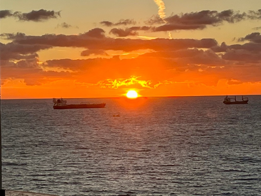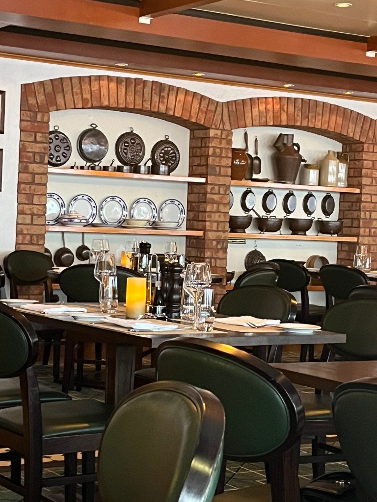 Day 1 onboard – arriving at the port by Uber, we were directed to the check-in area and before we knew it we were boarding the ship. Unfortunately, our stateroom was not ready and was eventually delayed in being announced ready to occupy. So first, we checked out the lunch offerings. They still haven’t quite mastered serving appropriately heated food choices. Cold was no problem! We finally got the all-clear to gather our luggage and enter our stateroom. Time to unpack, such as it is, hang up clothes and take advantage of the complimentary pressing of the red dresses and bag of dirty laundry to be returned in 3 days. Eventually it was time to head out to dinner and sail away from Lisbon.
