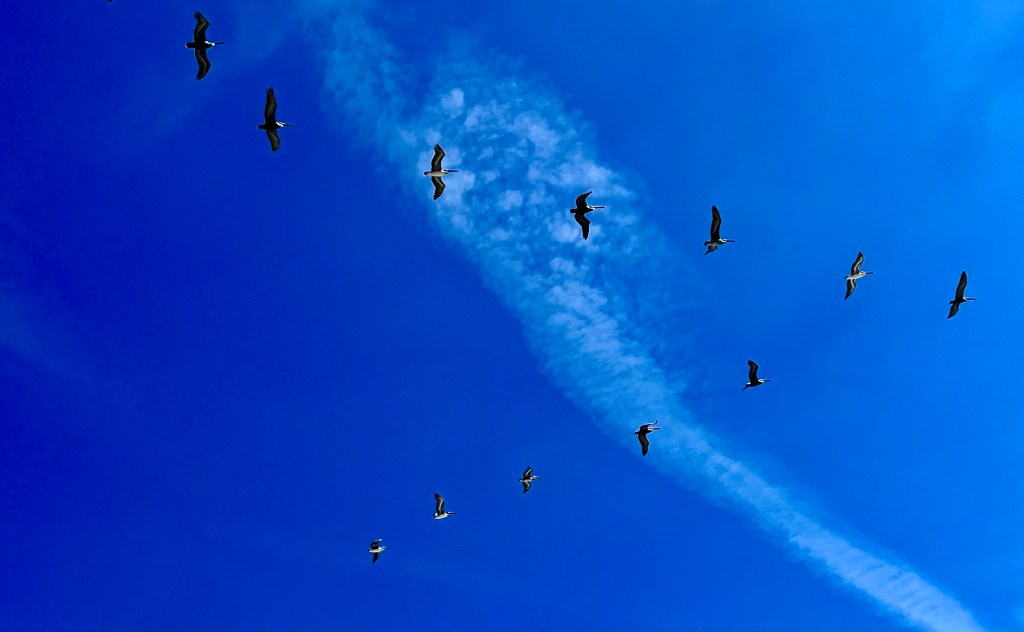 Pelicans in flight