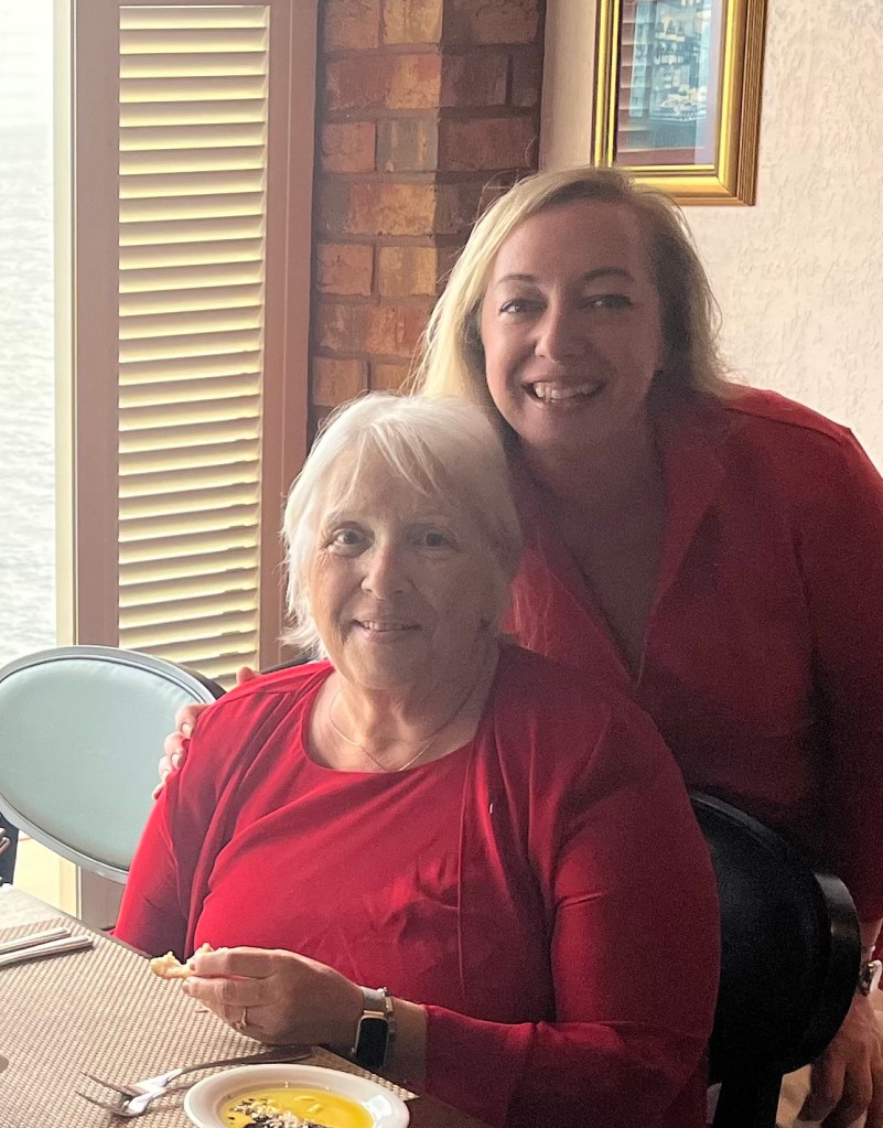 Tonight was red dress-up night for our specialty restaurant reservation. We shared a table with 2 other couples. It made for interesting conversation. Too bad the ship’s steakhouse doesn’t know how to cook steak to order!