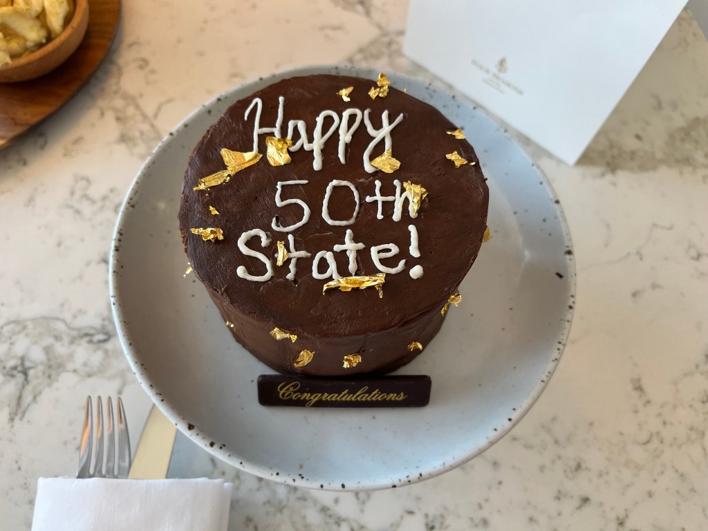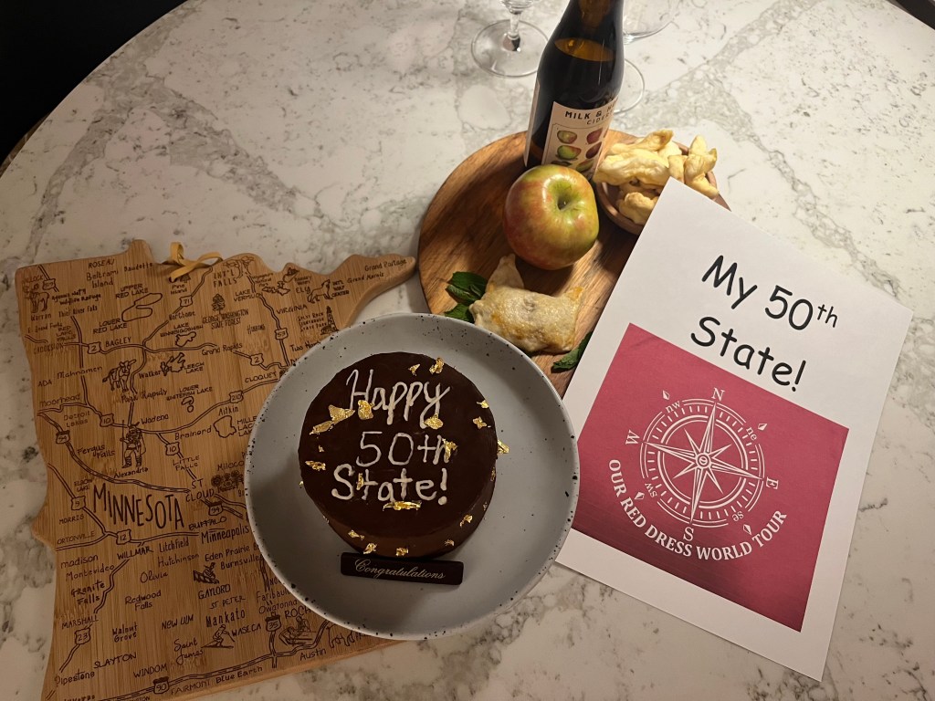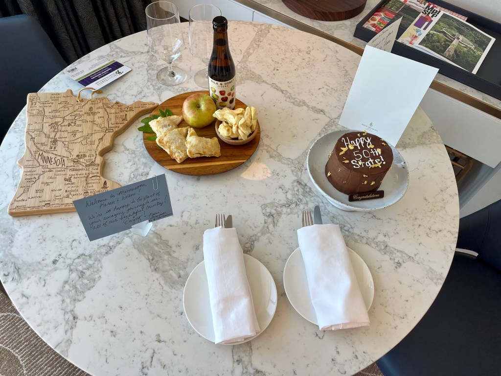We received a warm mid-west welcome from the Minneapolis Four Seasons staff upon our arrival. In our room, our table was loaded with welcome notes from FS friends, an ammenity of hand-held apple pie goodness (in the shape of Minnesota!), some dried apple slices, cider and a Minnesota-shaped cutting board. But the best item was the little layer cake that Karen had sent to commemorate my 50th state visit! Our stay at FSMN marks the 21st Four Seasons property I have stayed at; some I’ve stayed at more than once (but only counted as one) all thanks to Karen.