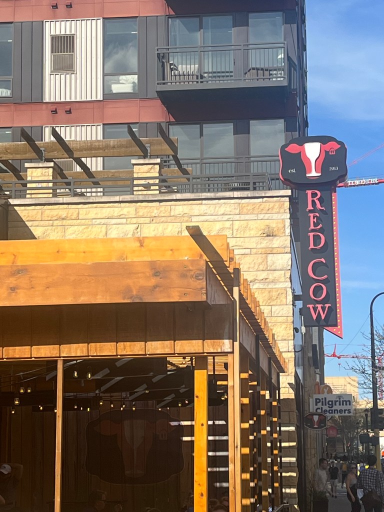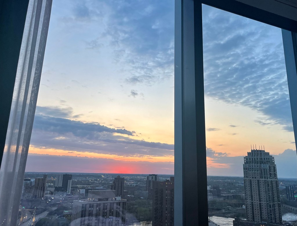 Upon arrival and after check-in, Karen decided that we needed some pampering so off to the spa we went for mani-pedi’s and a facial for me. We stopped at the Red Cow for a beer of the world entry and a favorite local snack of warm homemade chips and onion dip. Then, back to the hotel for some RR&R before a late dinner at the Terrace Cafe, overlooking the pool area and downtown Minneapolis and the Mississippi River. It was a beautiful day until the sun set and then the chill came into the air. But have no fear! Our server, Kim, wrapped us in warm blankets so we could finish our meal.