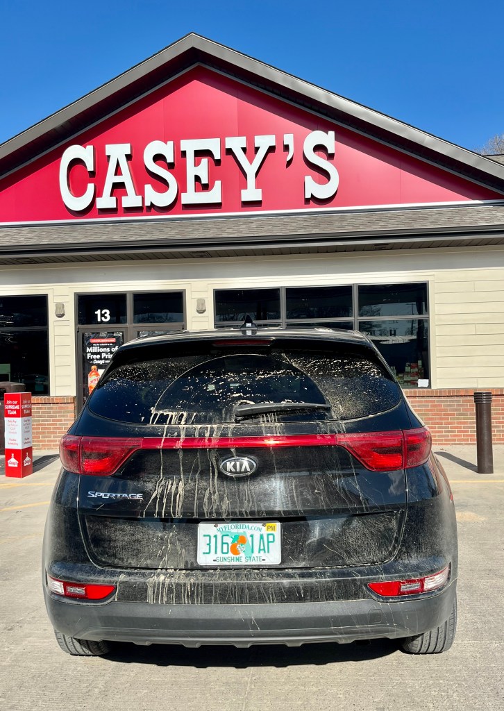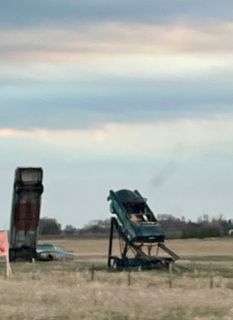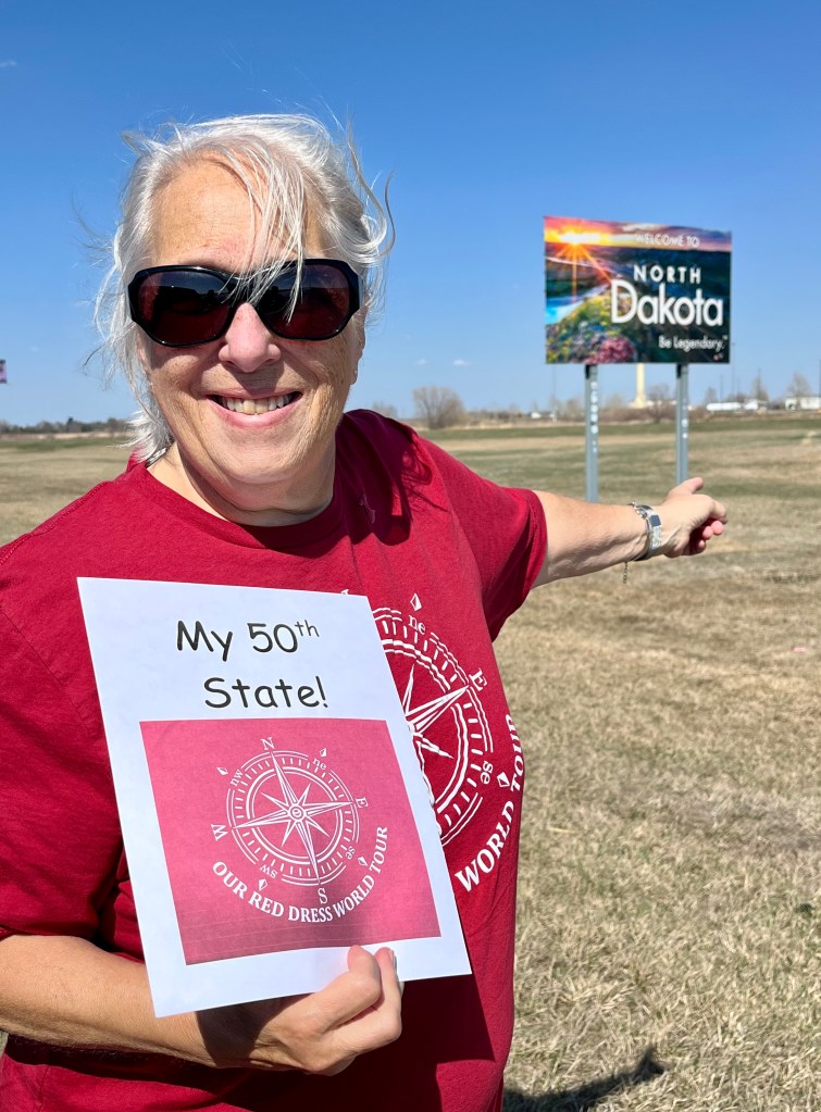 Friday was Road Trip day to visit my 50th state – North Dakota. It was a bit overcast but a beautiful day for a drive. Our GPS took us right where we needed to be to visit 3 states at the same time – Minnesota, North Dakota and South Dakota. As we were driving along the road, Karen was in South Dakota on her side and I was in North Dakota on my side! Getting out to get pictures of the welcome signs was a bit dicey as the speed limits in this area were 80mph! But we safely pulled over, grabbed a few quick pictures to document the events – my 50th state visit and Karen’s 40th state visit. It was a long but great day making memories with Karen. If you follow me on FB then you are familiar with our commentary regarding dirt roads and city girl (Karen). But I have to tell you she did a great job safely driving us around for four days. Lots of farms, grain silos, brown fields and a collection of “limos on a stick!” If you haven’t heard of Atlas Obscura, check it out for roadside attractions across the states. On our way home, we stopped in Alexandria, MN – not to be confused with Alexndria, VA – for dinner at Perkins. Still looks the same as it did back home years ago before they moved away from Rochester. Still flying the oversized American flag. I enjoyed my 55+ turkey dinner. Our black rental KIA got very dusty and unfortunately we missed the big rain on Saturday to wash it all off. Sorry about that Hertz!