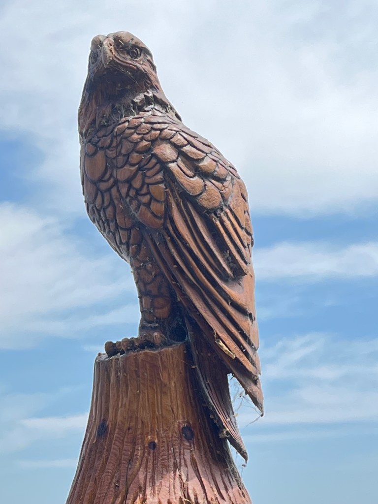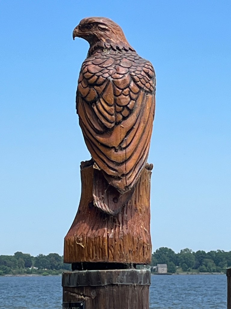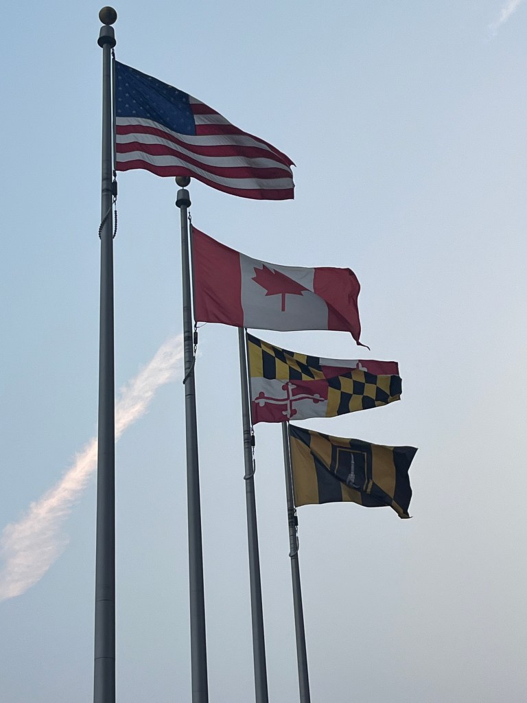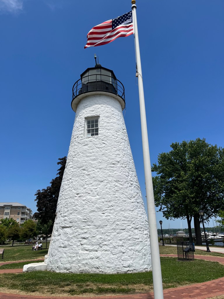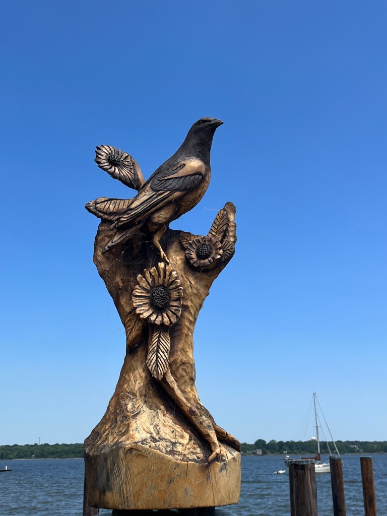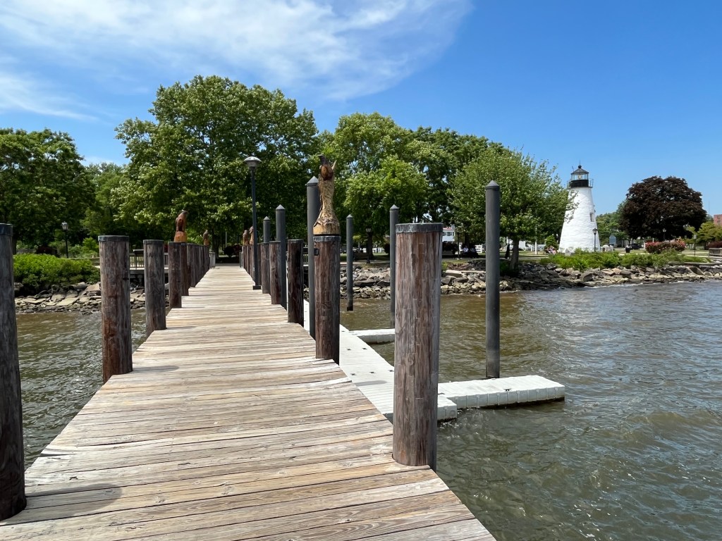 We had read about a quaint little historical town in Maryland called Havre de Grace, on the waterfront and with a lighthouse. It seemed like a good excuse for a road trip on Karen’s day off, which coincidentally was her birthday. Our GPS took us right to the lighthouse on the harbor (Havre is French for harbor). Lots of War of 1812 activity here, with the long-standing light keeper playing a heroic part in it all. We walked around the area and out onto the dock adorned with carvings of local, regional birds. I love being on or by the water and it was a lovely sun-filled day to be out and about. Sadly, many of the stores and shops were closed on a Tuesday so after a bit of a drive around town, we decided to head to another historical town we have wanted to visit and that was on the way home – Ellicott City, Maryland.