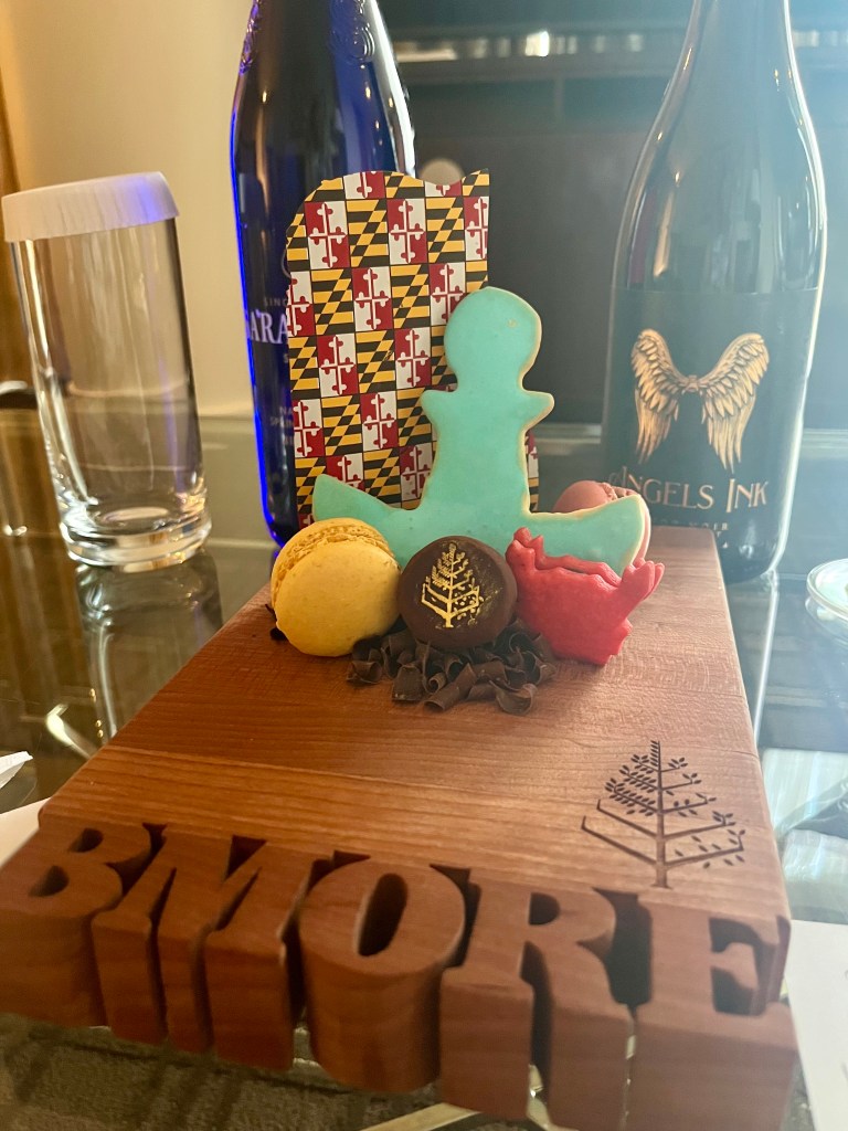 We were treated to a wonderful suite at the Baltimore Four Seasons, with a lighthouse view. The amenity was a BMORE cutting board with chocolate shavings, an anchor sugar cookie, a cute crab macaroon, two other macaroons and a chocolate truffle with the Four Seasons logo in gold dust as well as a bottle of Saratoga water and a bottle of red wine. So nice to be spoiled! I always look forward to the amenities as they are usually unique to the the area (hence the anchor and crab).