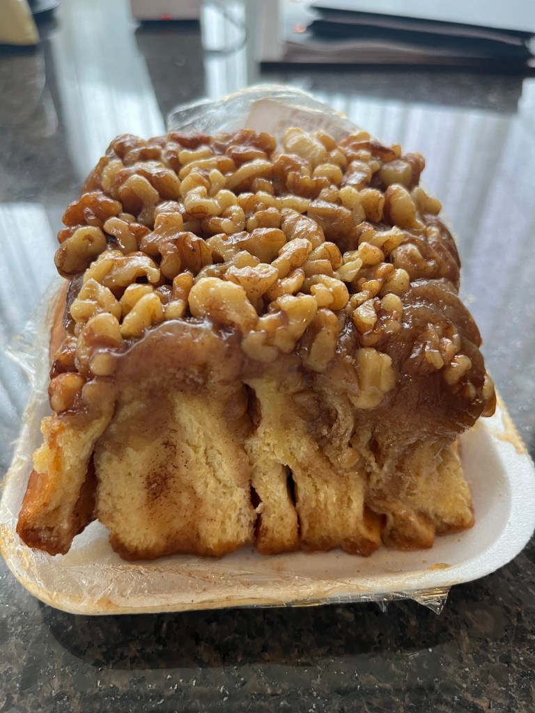 We ended our day with a stop at a Mennonite Farm Market, where we finally found Amish Cheese and a few other goodies. All too soon the shops were closing so it was time to head back to Baltimore. A huge shout-out to my city kid, Karen, for navigating the hills, road twists and turns and Amish buggies while driving the back roads on our return to Baltimore. We didn’t find as many farm stands as I remembered from years ago, but we did happen upon one and brought home-grown tomatoes, cucumbers, corn on the cob, a honeydew melon and an oatmeal whoopee pie. Quite the haul! The corn on the cob was grilled to perfection along with Zweigle’s red hots by Karen and complimented with Bush’s Original Baked Beans. A delicious tomato was enjoyed on a BLT for lunch. And the cucumber and tomato will be enjoyed in a chef’s salad tomorrow. The melon is chilling and will be a good TV snack later. And the whoopie pie? Well that was a load of sweetness! The sticky bun was delicious and breakfast shared with Karen the next morning.